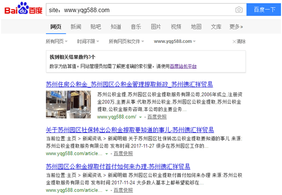 第二点我们去site网站的域名,结果出现的搜索结果只有三条,代表着网站收录过第里面的内容大部分都是没有抓取的状况,而且基本的栏目页都没有抓取,我们首先每天要做的就是提交给百度URL,收录网站里面的二几栏目页。还有就是做好友链的交换工作这样做也是为了增加百度抓取网站的频率,第三就是去各个平台上发布你网站的外链工作这点也是非常重要的,百度抓取别人网站的时候顺着路径就会来到你网站上面,也是尽早能看到你的网站里面的内容没有被收录。